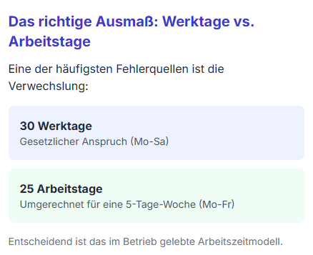 30 Werktagen. Entscheidend ist also nicht eine individuelle Vereinbarung, sondern das im Betrieb gelebte Arbeitszeitmodell. Diese Unterscheidung muss im Lehrvertrag korrekt abgebildet und in der Urlaubsverwaltung sauber geführt werden, um spätere Nachforderungen zu vermeiden.