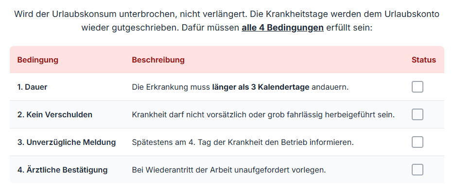 Es ist ein ärgerliches Szenario, aber ein rechtlich klar geregelter Fall: Wird ein Lehrling während seines Urlaubs krank, wird der Urlaubskonsum unterbrochen. Die Tage der Krankheit gelten dann nicht als Urlaubstage. Dafür müssen jedoch vier Bedingungen zwingend und vollständig erfüllt sein:
