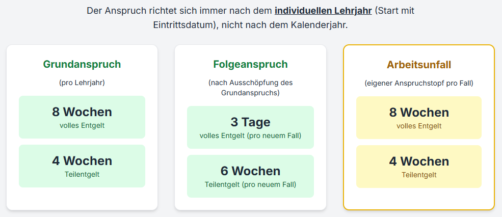 Der entscheidende Unterschied: Der Anspruch auf Entgeltfortzahlung für Lehrlinge richtet sich immer nach dem individuellen Lehrjahr, das mit dem Eintrittsdatum des Lehrlings beginnt. Beginnt die Lehre am 1. September, startet auch das "Entgeltfortzahlungs-Jahr" am 1. September und erneuert sich jedes Jahr an diesem Datum. Dies steht im Gegensatz zu vielen Regelungen für Arbeiter und Angestellte, bei denen das Arbeits- oder Kalenderjahr als Basis dient. Du musst also für jeden Lehrling ein individuelles Anspruchskonto führen.