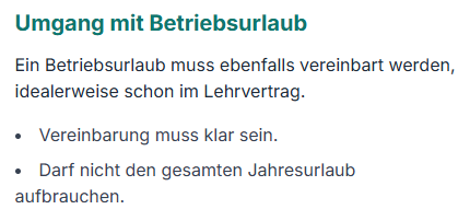 Der Betriebsurlaub darf nicht den gesamten Jahresurlaub des Lehrlings aufbrauchen. Es muss ihm ein angemessener Teil zur freien Verfügung bleiben.