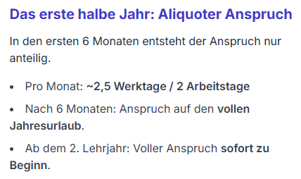 Gerade zu Beginn eines Lehrverhältnisses gibt es eine wichtige Schutzbestimmung für den Betrieb. In den ersten sechs Monaten entsteht der Urlaubsanspruch nur anteilig, also aliquot. Pro vollem Monat im Betrieb erwirbt der Lehrling einen Anspruch von 1/12 des Jahresurlaubs. Das entspricht rund 2,5 Werktagen oder 2 Arbeitstagen pro Monat.