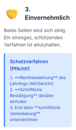 Dieser Schritt ist keine reine Bürokratie, sondern ein vom Gesetzgeber bewusst geschaffener Schutzmechanismus. Er trägt dem Machtungleichgewicht zwischen Betrieb und Lehrling Rechnung. Ein Lehrling könnte unter Druck gesetzt werden, einer Auflösung zuzustimmen, obwohl er vielleicht Anspruch auf Schadenersatz bei einem gerechtfertigten Austritt hätte. Die Belehrung durch die AK oder das Gericht stellt sicher, dass die Zustimmung des Lehrlings auf einer informierten Entscheidung beruht. Die Beweislast, dass dieser Schritt korrekt und vor der Unterzeichnung erfolgt ist, liegt bei dir.