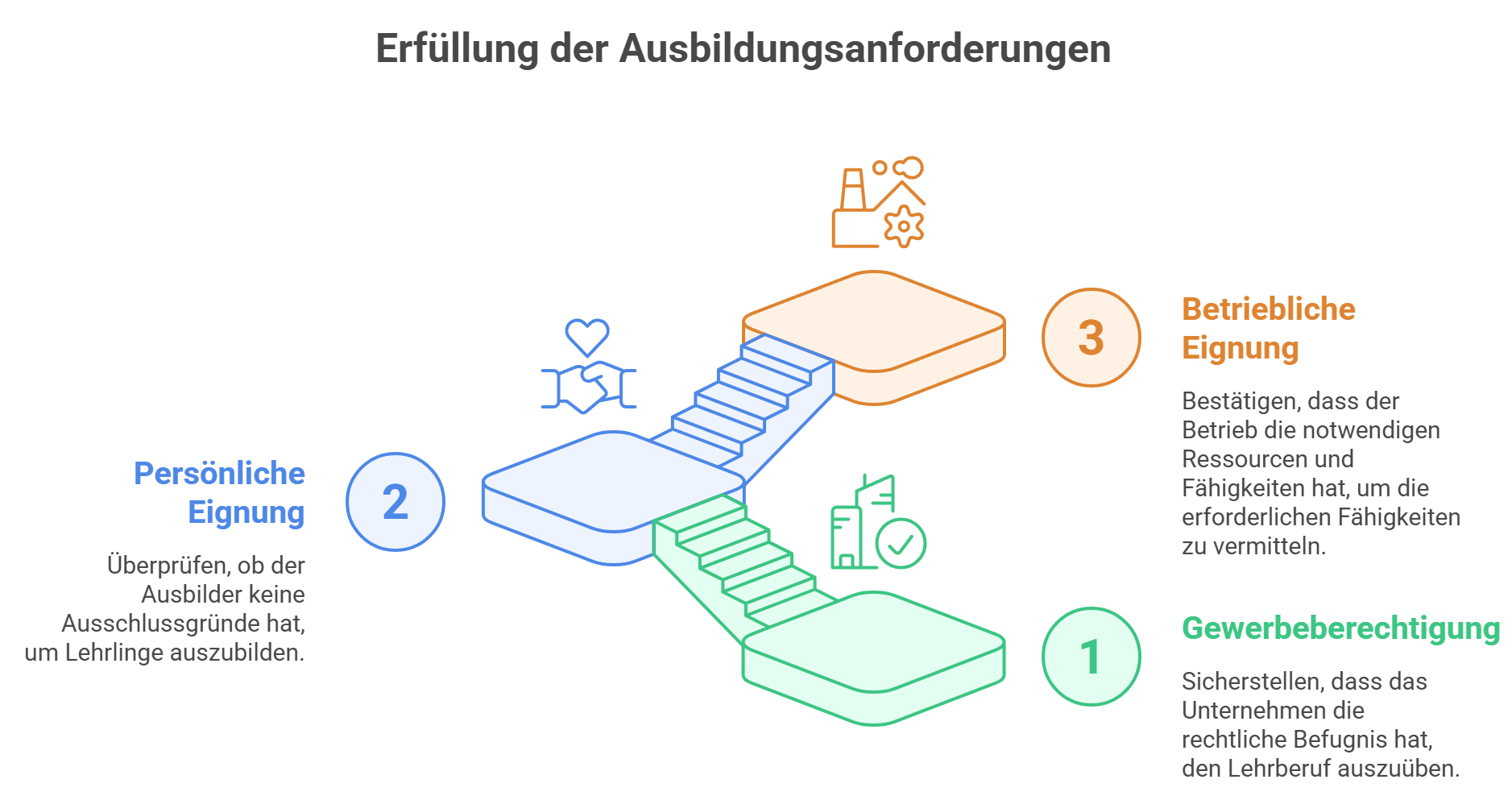 Damit dein Unternehmen die Rolle des Lehrberechtigten übernehmen darf, müssen gemäß Berufsausbildungsgesetz mehrere Kriterien erfüllt sein. Diese stellen sicher, dass der Betrieb eine solide und seriöse Basis für die Ausbildung bietet.