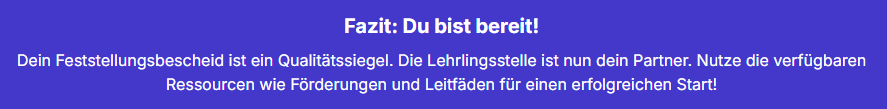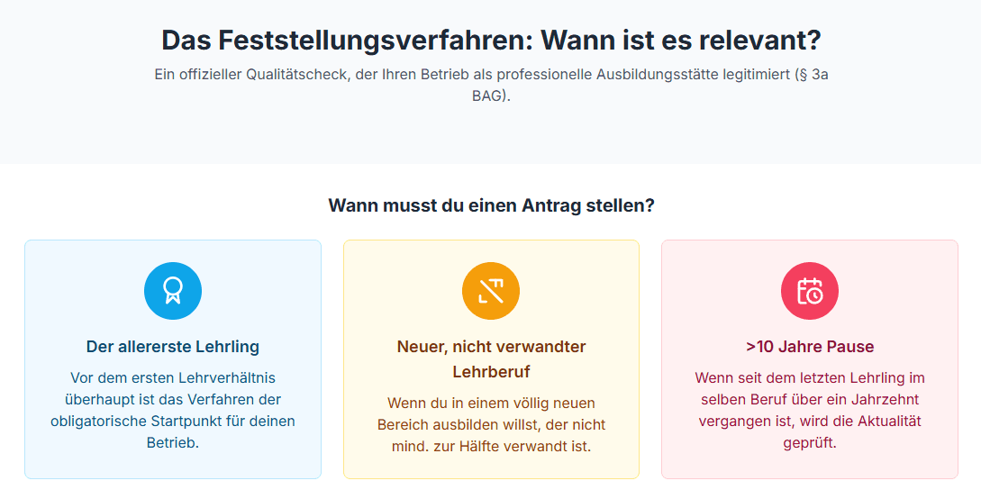 Wichtiger Tipp – Die 18-Monats-Frist: Solltest du zum Zeitpunkt des Antrags die Ausbilderqualifikation noch nicht besitzen, ist das kein Hinderungsgrund! Das Gesetz räumt dir eine Frist von 18 Monaten ab Rechtskraft des Feststellungsbescheids ein, um die Qualifikation nachzuholen oder einen bereits qualifizierten Ausbilder zu bestellen. In dieser Übergangszeit darfst du den Lehrling bereits ausbilden.