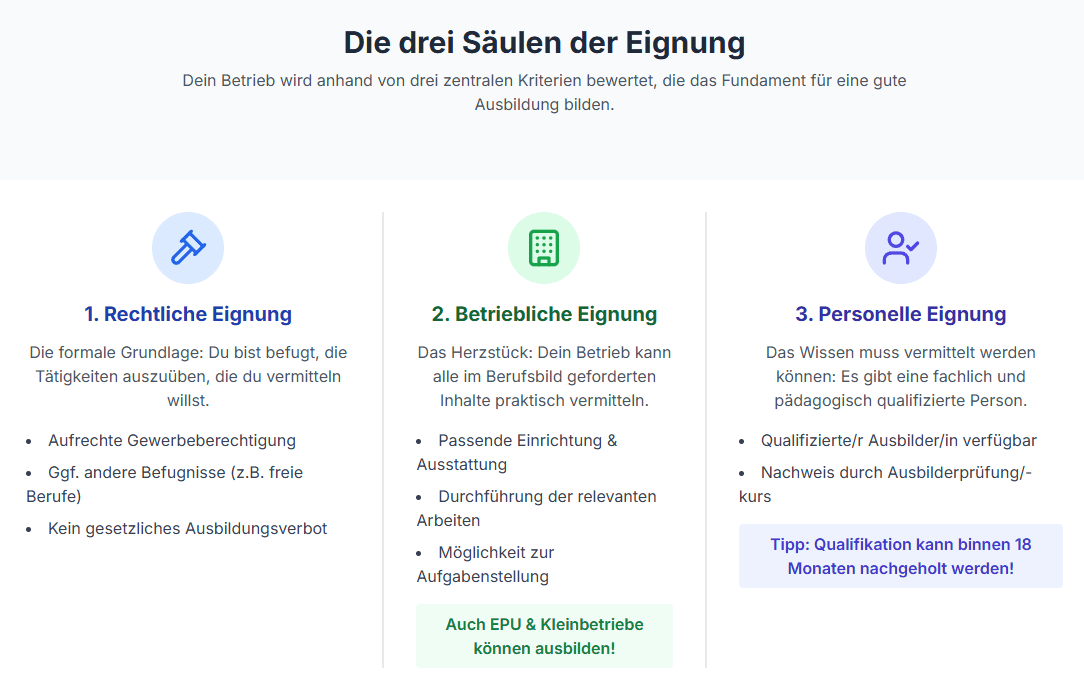 Dies ist die formale Grundlage. Die Lehrlingsstelle prüft, ob du rechtlich überhaupt befugt bist, die Tätigkeiten auszuüben, die du dem Lehrling beibringen sollst.