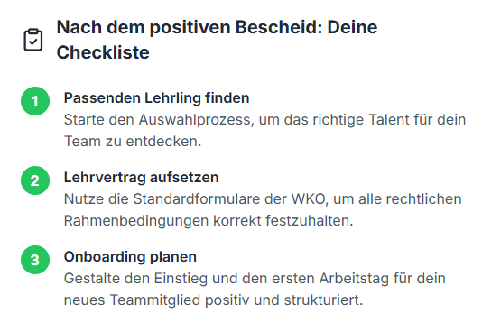 Sieh den Prozess als Chance, deine eigenen Abläufe zu reflektieren und die Ausbildung von Anfang an auf ein solides Fundament zu stellen. Mit der Genehmigung bist du nicht allein. Die Lehrlingsstelle ist von nun an nicht mehr nur Prüfinstanz, sondern dein zentraler Ansprechpartner und Partner in allen Fragen der Ausbildung. Nutze die Ressourcen, die dir jetzt zur Verfügung stehen! Informiere dich über Förderungen, verwende die professionellen Ausbildungsleitfäden und bleibe mit deiner Lehrlingsstelle in Kontakt.