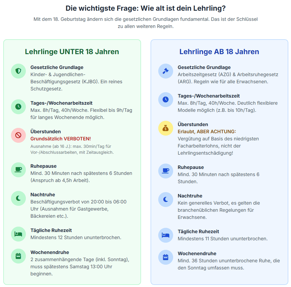 Für Lehrlinge unter 18 Jahren: Das Kinder- und Jugendlichen-Beschäftigungsgesetz (KJBG) Dieses Gesetz ist ein reines Schutzgesetz. Sein oberstes Ziel ist der Schutz der Gesundheit und der Entwicklung des Jugendlichen, nicht die maximale wirtschaftliche Flexibilität des Betriebs. Die Regeln sind daher bewusst streng und lassen nur wenig Spielraum.