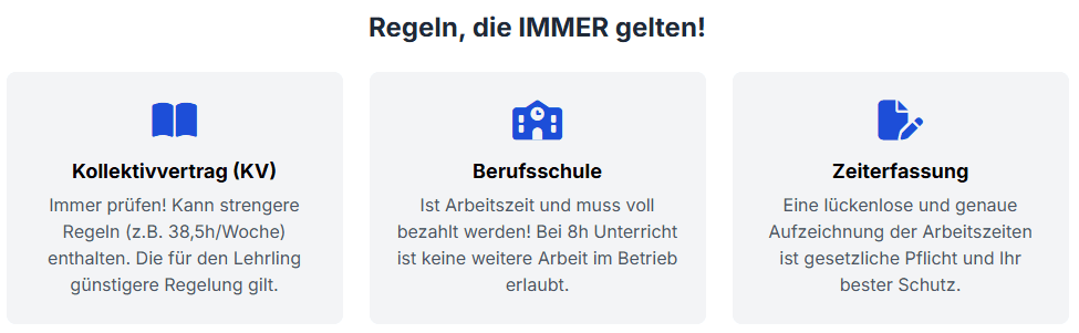 Die klarste Regel zuerst: Für jugendliche Lehrlinge sind Überstunden grundsätzlich verboten. Dies soll sicherstellen, dass der Fokus auf der Ausbildung und nicht auf der Abarbeitung von Produktionsspitzen liegt.