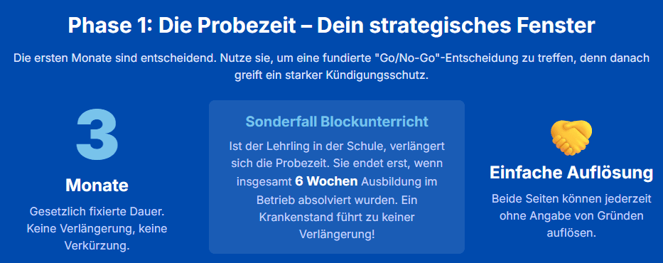 Auflösung in der Probezeit | Erste 3 Monate (oder bis 6 Wochen Betriebspraxis bei Blockunterricht) | Jederzeit, ohne Grund und Frist möglich. Deine wichtigste strategische Phase zur Eignungsprüfung! |
