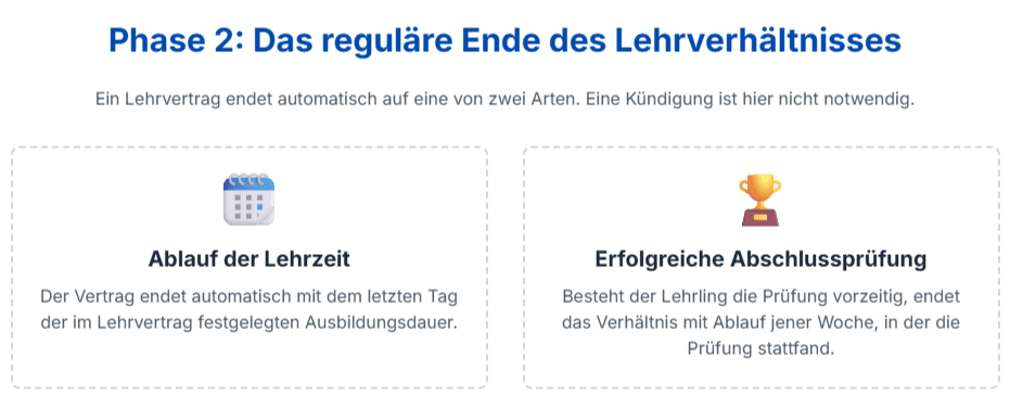 Die häufigste und einfachste Form der Beendigung ist der Ablauf der im Lehrvertrag festgelegten Lehrzeit. Das Lehrverhältnis ist ein befristeter Vertrag, der mit dem letzten Tag der für den jeweiligen Lehrberuf vorgeschriebenen Ausbildungsdauer automatisch endet. Wenn die Lehrzeit beispielsweise drei Jahre beträgt und am 31. August endet, ist dies der letzte Tag des Lehrverhältnisses.