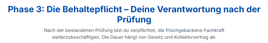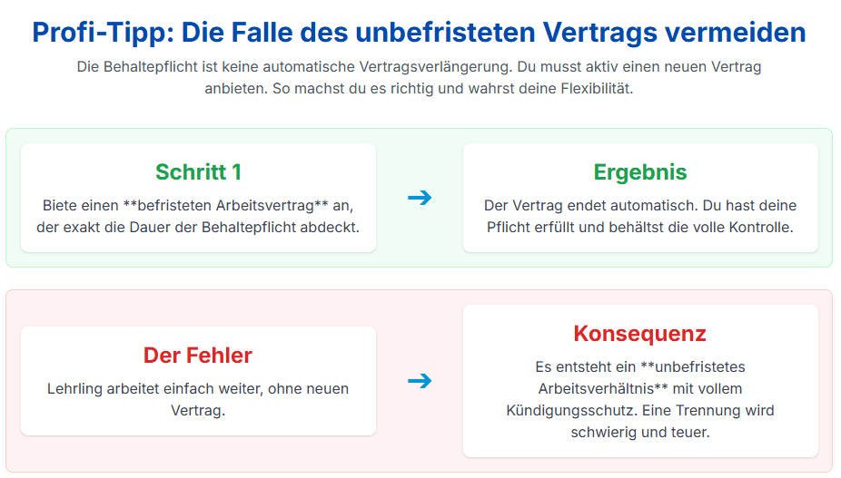 Diese Regelung schafft einen Anreiz für gute Leistungen und ermöglicht es dem Unternehmen, eine qualifizierte Fachkraft früher als geplant zu beschäftigen – was direkt zum nächsten Thema, der Behaltepflicht, überleitet. Die Vorhersehbarkeit dieser Enddaten ist ein großer Vorteil für deine Personalplanung, da du den Übergang vom Lehrling zur Fachkraft frühzeitig und strukturiert vorbereiten kannst.