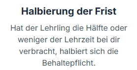 Beispiel: Ein Lehrling hat eine dreijährige Lehrzeit. Er war die ersten zwei Jahre in einem anderen Betrieb und wechselt für das letzte Jahr zu dir. Da er weniger als die Hälfte (1,5 Jahre) bei dir war, reduziert sich eine gesetzliche Behaltepflicht von drei Monaten auf 1,5 Monate.