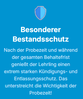 Diese Flexibilität ist kein Zufall, sondern vom Gesetzgeber bewusst so gestaltet. Sie steht in einem direkten Zusammenhang mit dem, was danach kommt: ein extrem starker Kündigungs- und Entlassungsschutz, der sogenannte besondere Bestandsschutz. Sobald die Probezeit abgelaufen ist, wird es außerordentlich schwierig, ein Lehrverhältnis einseitig zu beenden.