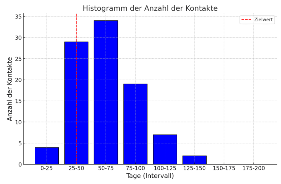 Unser Ziel ist es, dadurch die durchschnittliche Prozesszeit auf 25-50 Tage zu reduzieren, was im Diagramm durch einen roten senkrechten Strich dargestellt ist.