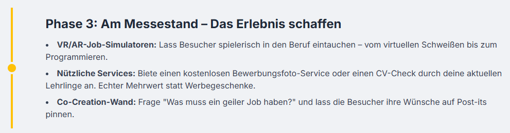 Um auf einer Lehrlingsmesse aus der Masse herauszustechen, bedarf es mehr als eines Standardstandes. Du brauchst einen strategisch geplanten Angriff auf die Sinne und die Neugier der Zielgruppe. Die folgenden Ideen sind in vier Phasen gegliedert – vor, auf dem Weg zu, an und abseits des Messestandes. Jede Taktik ist darauf ausgelegt, die Erkenntnisse über die Generation Z zu nutzen und einen maximalen, viralen Effekt zu erzielen.