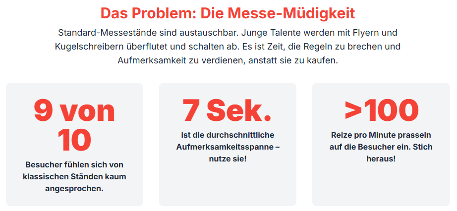 Die Ausgangslage auf Lehrlings- und Berufsinformationsmessen ist für ausstellende Unternehmen eine zunehmend anspruchsvolle Herausforderung. Die Hallen sind gefüllt mit standardisierten Messeständen, die sich in ihrer Aufmachung kaum unterscheiden. Junge Besucherinnen und Besucher werden mit einer Flut an austauschbaren Slogans, Broschüren und Werbegeschenken konfrontiert. Diese Reizüberflutung führt unweigerlich zu einer Ermüdung und einem Desinteresse bei der anvisierten Zielgruppe. In diesem Meer der Gleichförmigkeit besteht die zentrale Aufgabe nicht mehr nur darin, gesehen zu werden, sondern auf eine Art und Weise wahrgenommen zu werden, die nachhaltig in Erinnerung bleibt. Es geht darum, aus dem Grundrauschen der allgegenwärtigen Werbeflut herauszustechen und eine echte Verbindung zu potenziellen Lehrlingen aufzubauen.