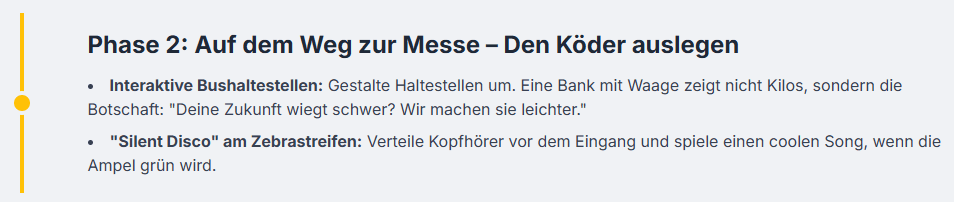 Eine oder mehrere Bushaltestellen auf den Hauptzufahrtswegen zur Messe werden temporär umgestaltet. Ein Beispiel, adaptiert von einer FitnessFirst-Kampagne , wäre eine Sitzbank, die mit einer integrierten Waage verbunden ist. Anstatt des Gewichts zeigt ein digitales Display jedoch eine Botschaft an: "Deine Zukunftsentscheidung wiegt schwer? Wir machen sie leichter. Besuch uns in Halle C, Stand 42." Diese unerwartete Interaktion bricht die Monotonie des Wartens, sorgt für Gesprächsstoff und verankert die Standnummer im Gedächtnis.