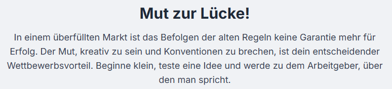 Letztendlich erfordert Guerilla-Recruiting vor allem eines: Mut. Den Mut, ausgetretene Pfade zu verlassen, Fehler zu machen und das Risiko des Unkonventionellen einzugehen.In einem hart umkämpften Markt ist das Befolgen der alten Regeln keine Garantie mehr für Erfolg. Es führt lediglich dazu, Teil des grauen Durchschnitts zu bleiben. Der Mut, die Regeln kreativ zu hinterfragen und gezielt zu brechen, kann der entscheidende Wettbewerbsvorteil sein, um die Talente von morgen zu gewinnen. Beginne klein, teste eine Idee, messe den Erfolg und lerne daraus. Werde zu dem Arbeitgeber, über den man spricht – nicht weil du am lautesten schreist, sondern weil du die cleverste und überraschendste Geschichte erzählst.