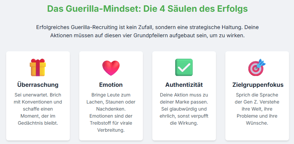 Die Prinzipien des Guerilla-Marketings, ursprünglich von Jay C. Levinson formuliert, lassen sich direkt auf die Personalbeschaffung übertragen und bilden das Fundament für jede erfolgreiche Kampagne.Diese Pfeiler sind keine optionalen Extras, sondern zwingende Voraussetzungen.