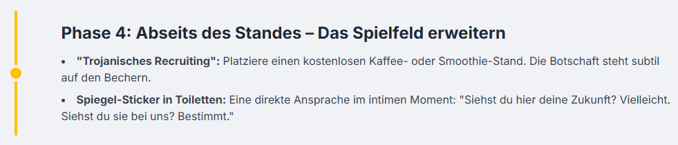 Diese Taktik nutzt Tarnung, um an unerwarteten Orten präsent zu sein.Anstatt direkt als Unternehmen aufzutreten, wird eine scheinbar unabhängige Serviceleistung angeboten. Ein mobiler Kaffeewagen, eine Popcorn-Maschine oder ein Smoothie-Stand wird an einem strategisch günstigen Ort in der Messehalle platziert. Die Produkte werden kostenlos oder sehr günstig abgegeben. Der Clou liegt im Detail: Auf den Bechern, Tüten oder Servietten befindet sich eine subtile, aber klare Botschaft: "Energie für deine Entscheidung? Hol dir den Rest bei uns: Halle C, Stand 42." oder "Guter Geschmack? Haben wir auch bei der Jobauswahl. Besuch uns..."