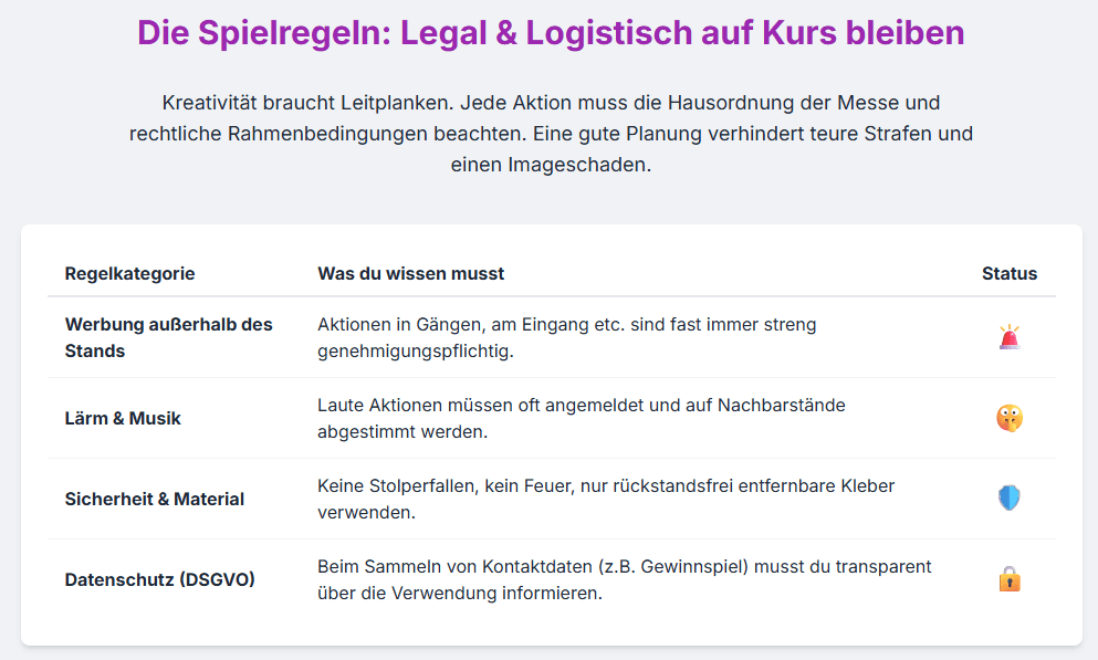 Guerilla-Recruiting lebt von Kreativität und dem Bruch mit Konventionen. Doch dieser kreative Freiraum existiert nicht im luftleeren Raum. Jede noch so geniale Idee muss sich an rechtliche und logistische Rahmenbedingungen halten, damit du nicht nur erfolgreich, sondern auch legal handelst. Insbesondere auf dem stark regulierten Terrain einer Messe ist die genaue Kenntnis der "Spielregeln" unerlässlich. Eine Missachtung kann nicht nur zu empfindlichen Strafen, sondern auch zum sofortigen Abbruch deiner Aktion und einem erheblichen Imageschaden führen.
