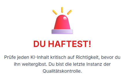 Du musst dir immer bewusst sein, dass KI-Systeme, insbesondere generative Modelle wie ChatGPT, dazu neigen zu "halluzinieren". Das bedeutet, sie können überzeugend klingende, aber komplett erfundene oder falsche Informationen ausgeben.Daher ist es Teil deiner professionellen und rechtlichen Sorgfaltspflicht als Ausbilderin, jeden einzelnen von einer KI generierten Inhalt kritisch zu hinterfragen und auf seinen Wahrheitsgehalt zu überprüfen, bevor du ihn an deine Lehrlinge weitergibst. Du bist und bleibst die letzte Instanz der Qualitätskontrolle.