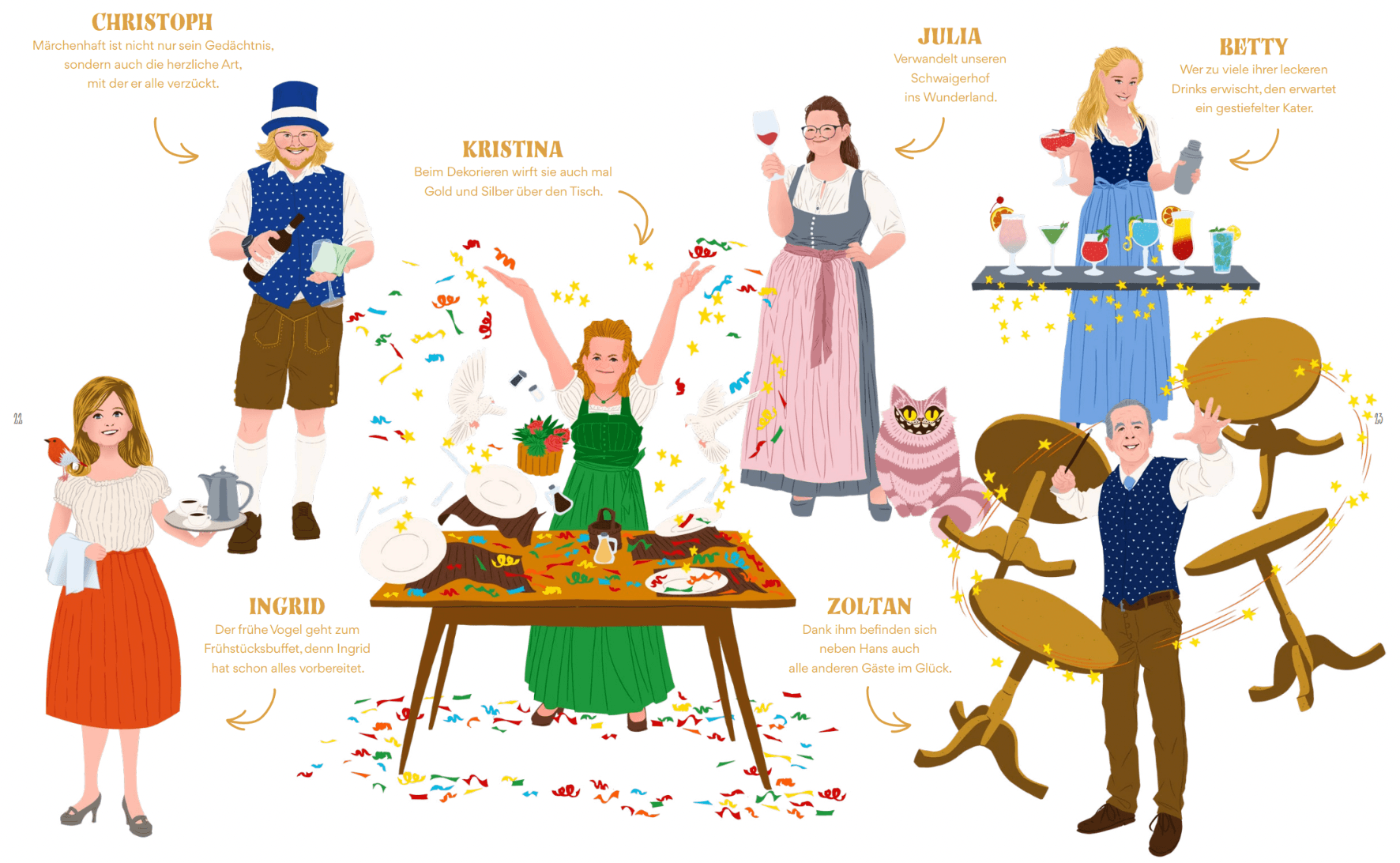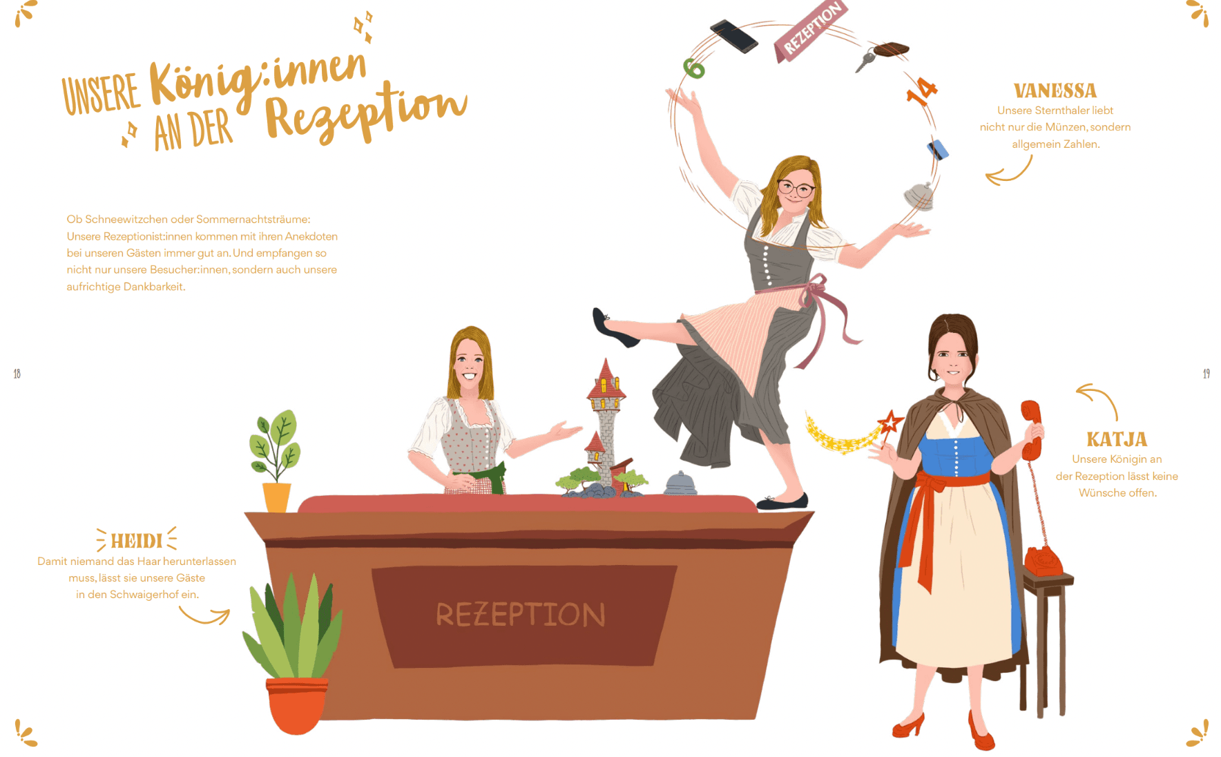 Das zentrale Element der Kampagne ist ein Märchenbuch, das den Schwaigerhof und seine Mitarbeiter auf magische Weise porträtiert. Jeder der 70 Mitarbeiter wurde individuell illustriert und erhielt eine persönliche Märchenfigur, die ihre Rolle im Betrieb auf humorvolle und kreative Weise darstellt. Dieses Buch wurde nicht nur den Mitarbeitern überreicht, sondern auch als zentrales Werbemittel verwendet, um potenzielle Lehrlinge anzusprechen.