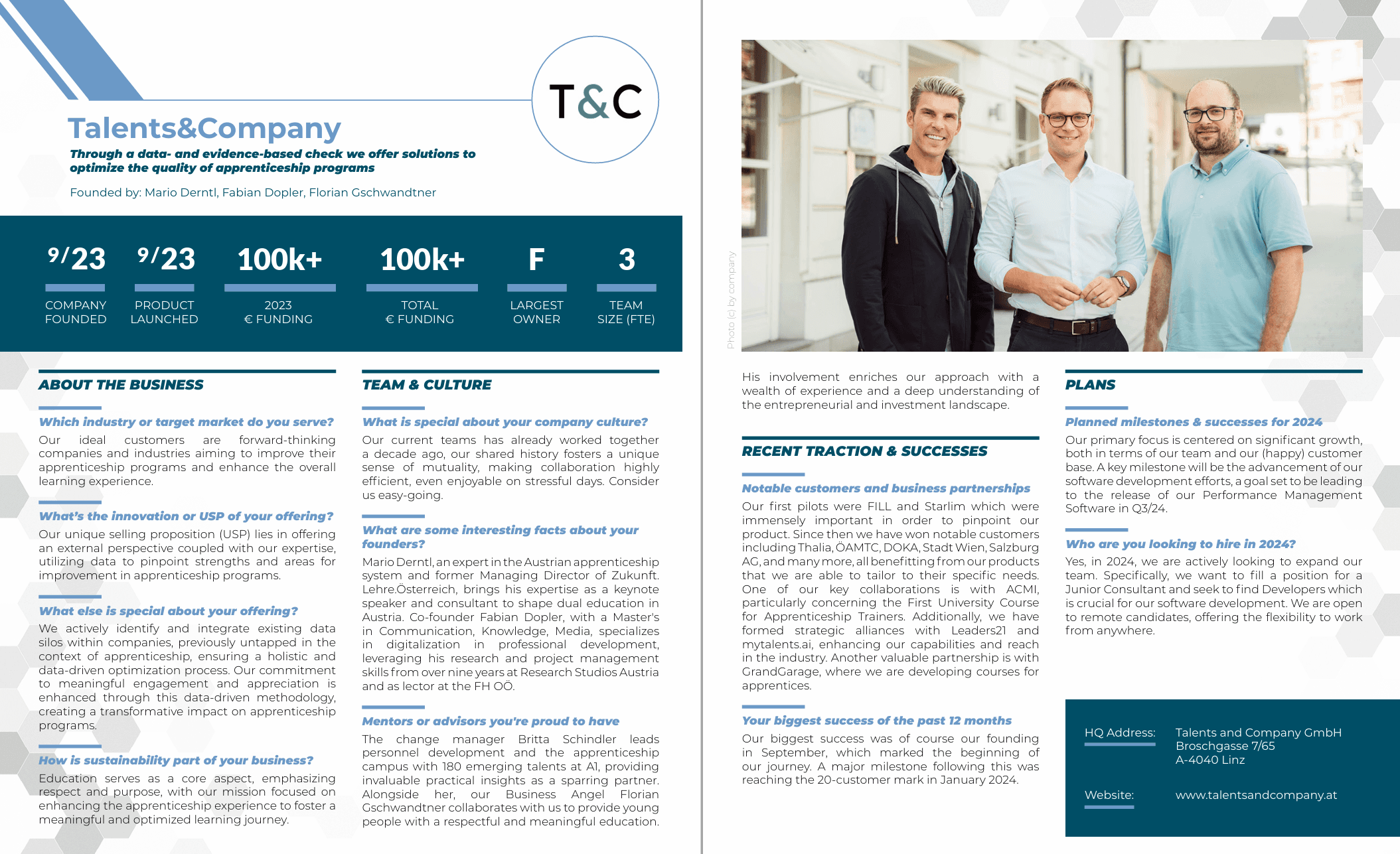 Im Jahr 2024 finden wir uns mit Stolz im Startup Report wieder, der umfassendsten jährlichen Veröffentlichung über die Startup-Finanzierung in Österreich. Der Bericht bietet nicht nur eine vollständige Liste der Finanzierungsabschlüsse über 100.000 €, sondern auch wertvolle Einblicke und Tipps von erfolgreichen Gründern und Branchenexperten. Unsere Erwähnung als "Talents and Company" im Startup Report 2024 unterstreicht unseren Beitrag und unsere Bemühungen in der Startup-Szene, insbesondere in der Unterstützung und Ausbildung junger Talente.