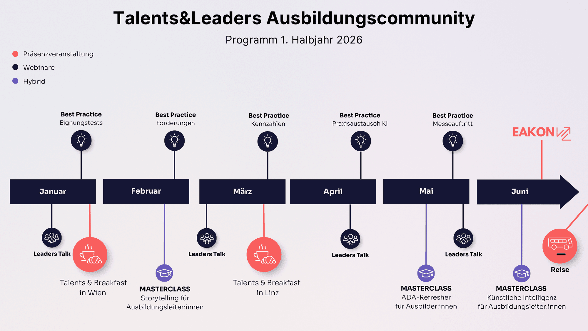Bei der EAKON haben wir auch das Programm für das erste Halbjahr unseres Talents & Leaders Angebots vorgestellt. Euch erwartet ein spannender Mix aus Formaten für Ausbildungsverantwortliche und Ausbilder:innen in der Lehrlingsausbildung.