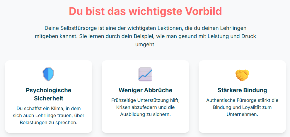 Deine Selbstfürsorge ist keine rein private Angelegenheit. Sie ist ein sichtbares und wirkungsvolles Ausbildungsinstrument. Wenn du gut auf dich achtest, lehrst du deine Auszubildenden eine der wichtigsten Lektionen für ihr gesamtes Berufsleben: wie man mit Druck und Herausforderungen gesund umgeht.