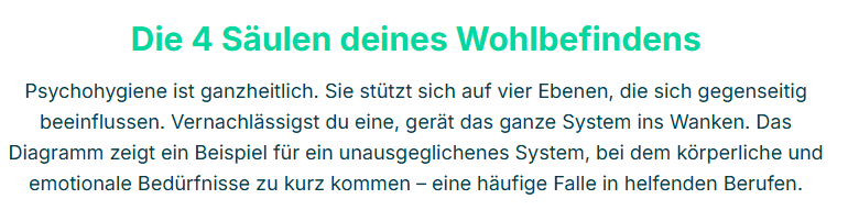 Psychohygiene ist kein isoliertes To-do, sondern ein ganzheitliches System, das auf vier miteinander verbundenen Ebenen wirkt. Vernachlässigst du eine, geraten die anderen ins Wanken. Stärkst du eine, hat das positive Effekte auf das gesamte System.