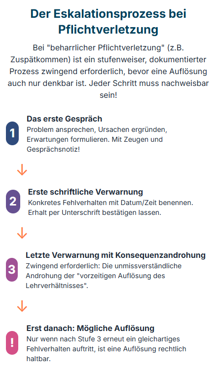 Nur wenn der Lehrling nach diesem dreistufigen, lückenlos dokumentierten Prozess erneut eine gleichartige Pflichtverletzung begeht, hast du eine solide rechtliche Grundlage für eine vorzeitige Auflösung. Jeder fehlende Schritt in dieser Kette schwächt deine Position massiv. Sieh diesen Prozess also nicht als Bestrafung, sondern als ein professionelles Interventionsprotokoll, das Fairness gewährleistet und deine Handlungen rechtlich absichert.