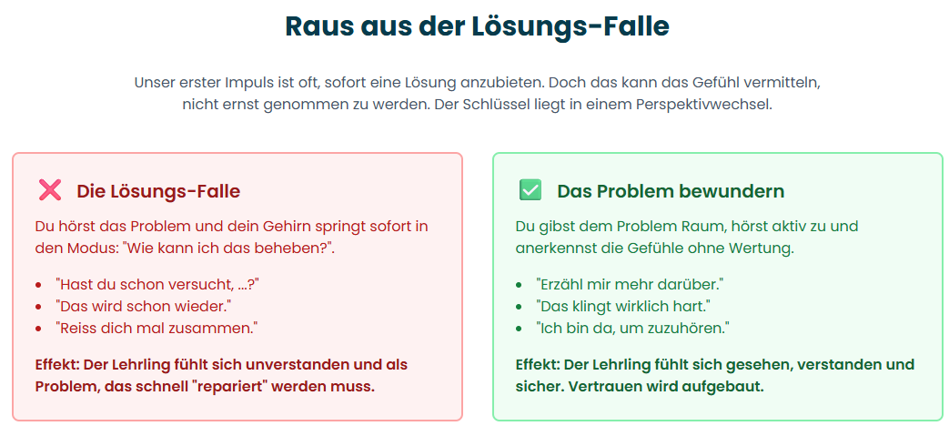 Ein Lehrling kommt auf dich zu. Die Schultern hängen, der Blick ist gesenkt, die Leistung im Betrieb hat nachgelassen. Dein erster Impuls, geboren aus echter Fürsorge und dem Wunsch zu helfen, ist wahrscheinlich: „Was ist los? Komm, wir finden eine Lösung. Hast du schon versucht, …?“ Dieser Impuls ist menschlich, verständlich und gut gemeint. Aber in den meisten Fällen ist er nicht das, was dein Lehrling in diesem Moment wirklich braucht. Willkommen in der Lösungs-Falle.