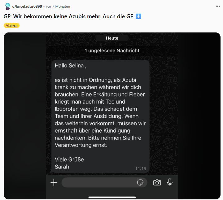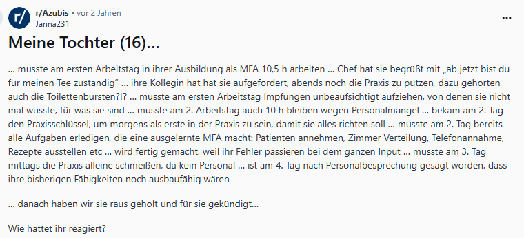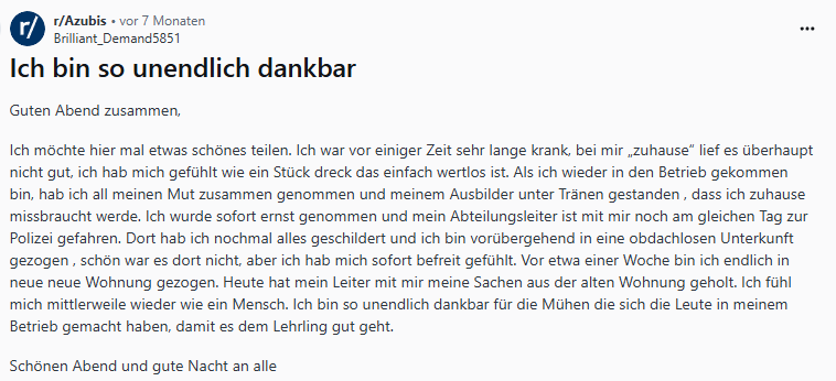 Einer dieser Subreddits ist "r/Azubis". Hier tauschen sich Auszubildende aus allen Branchen und Lehrjahren über ihre Erfahrungen aus. Ein besonders aufschlussreicher, wenn auch manchmal beunruhigender, Fundus sind die Diskussionen über "Worst-Case"-Beispiele in der Ausbildung. Hier berichten junge Menschen von sexueller Belästigung am Arbeitsplatz, davon, monatelang allein für eine Praxis verantwortlich gewesen zu sein, von Vorgesetzten, die sie schikanieren, oder von Ausbildungen, in denen sie keinerlei relevante Fähigkeiten vermittelt bekommen.