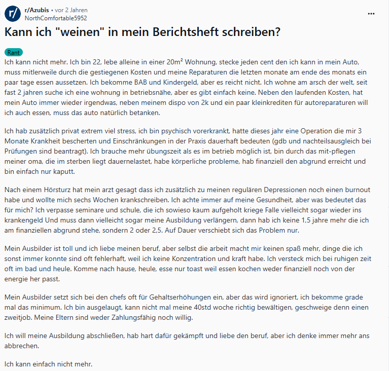 Wenn das Leben zu viel wird und die Seele zu zerbrechlich, um den Anforderungen einer Ausbildung standzuhalten, bleibt oft nur noch die nackte Verzweiflung. Die folgende schonungslose Schilderung eines Lehrlings wirft die Frage auf, ob man tiefste persönliche Not und den Wunsch, einfach nur noch "weinen" zu können, auch im offiziellen Berichtsheft festhalten darf. Sie ist ein erschütterndes Zeugnis der Überforderung, die viele junge Menschen in ihrer Ausbildung erleben.