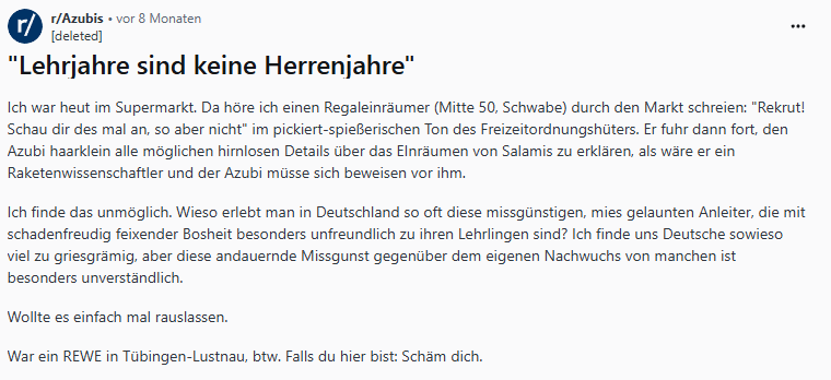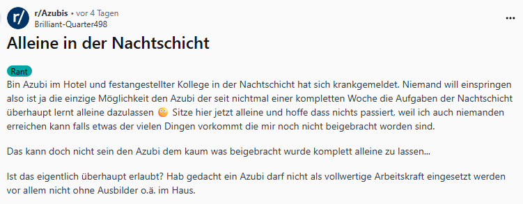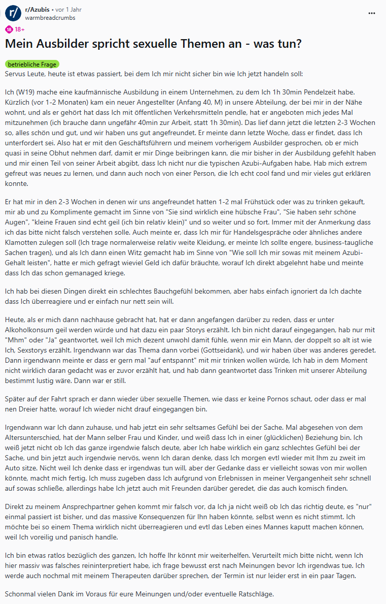 Einer dieser Subreddits ist "r/Azubis". Hier tauschen sich Auszubildende aus allen Branchen und Lehrjahren über ihre Erfahrungen aus. Ein besonders aufschlussreicher, wenn auch manchmal beunruhigender, Fundus sind die Diskussionen über "Worst-Case"-Beispiele in der Ausbildung. Hier berichten junge Menschen von sexueller Belästigung am Arbeitsplatz, davon, monatelang allein für eine Praxis verantwortlich gewesen zu sein, von Vorgesetzten, die sie schikanieren, oder von Ausbildungen, in denen sie keinerlei relevante Fähigkeiten vermittelt bekommen.