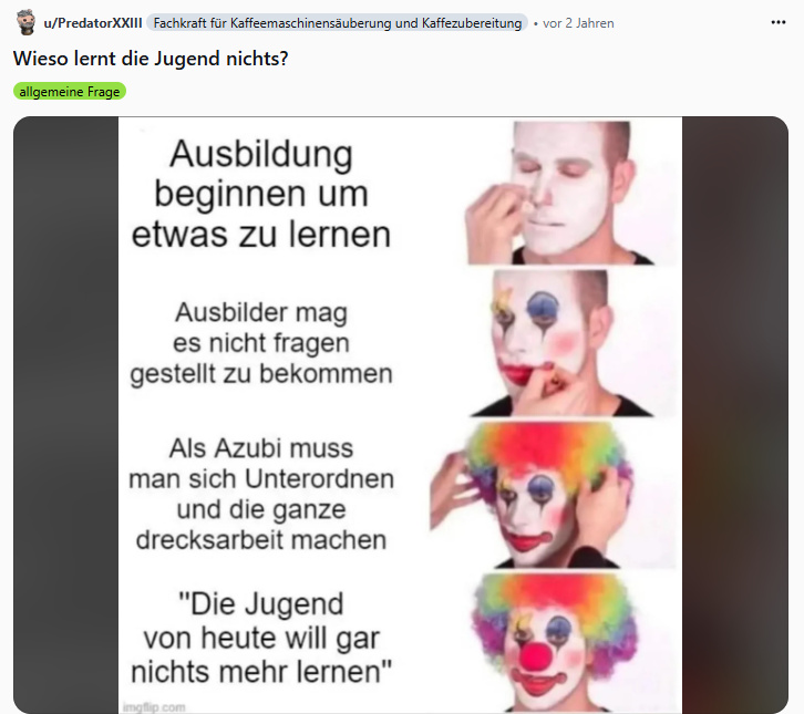 Manchmal stellt sich die Frage, warum die Jugend angeblich nichts mehr lernen will – und dieses Meme liefert die perfekte, wenn auch zynische, Antwort. Es enthüllt die genialen pädagogischen Methoden, die einen Lehrling von wissbegierig zu „will nichts lernen“ transformieren, indem Fragen unerwünscht sind und „Dreckarbeit“ die einzige Lehrstunde darstellt. Ein wahres Meisterwerk der Ausbildungsdemotivation.
