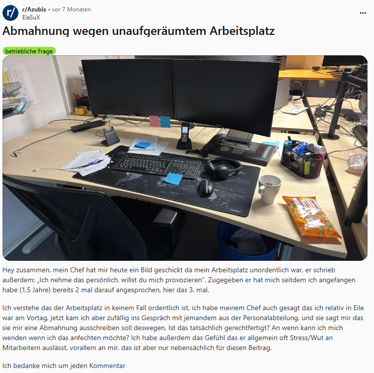 Manchmal sind die größten Herausforderungen im Berufsleben nicht komplexe Projekte, sondern die mysteriösen Tiefen der Schreibtischordnung. Die folgende Schilderung eines Lehrlings offenbart eine beispiellose Eskalation, bei der ein unaufgeräumter Arbeitsplatz nicht nur zu einer persönlichen Beleidigung für den Chef wird, sondern sogar eine offizielle Abmahnung nach sich zieht. Ein wahrhaft lehrreiches Beispiel dafür, wie Sauberkeit zum ultimativen Test der Loyalität wird.